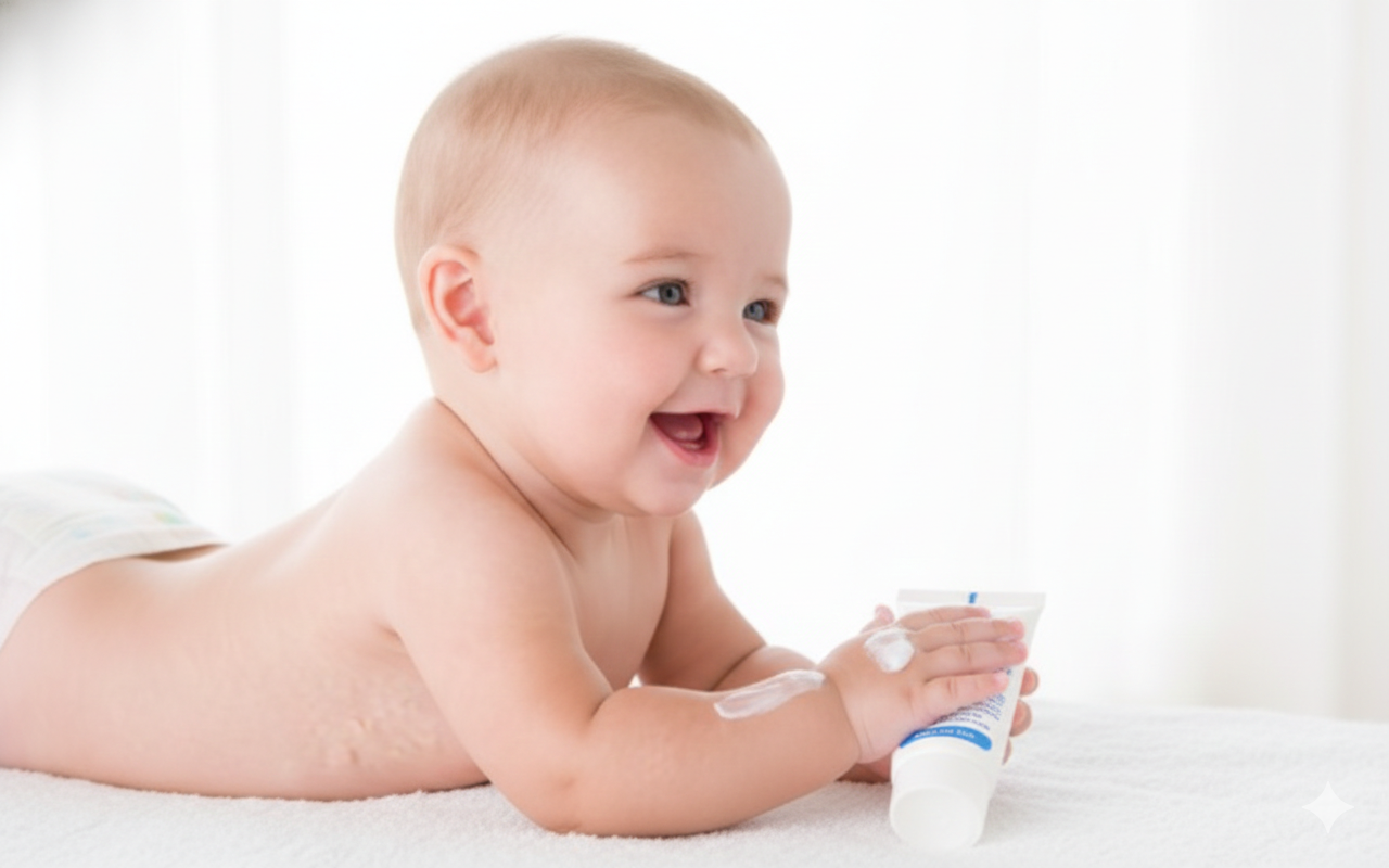 - Massage nhẹ nhàng để kem thẩm thấu tốt hơn và giúp bé thư giãn
